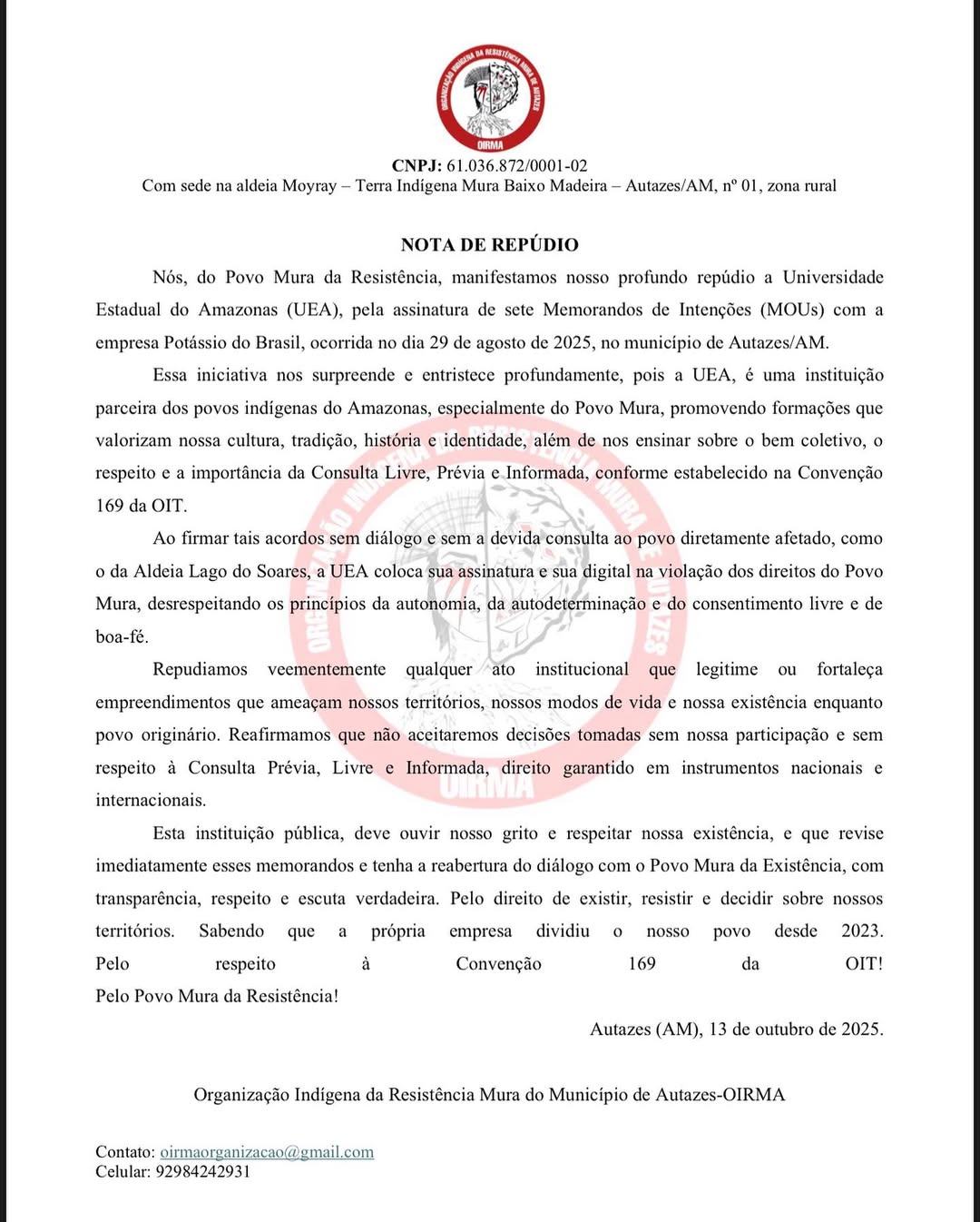 Nós, do Povo Mura da Resistência, manifestamos nosso profundo repúdio a Universidade Estadual do Amazonas (UEA), pela assinatura de sete Memorandos de Intenções (MOUs) com a empresa Potássio do Brasil, ocorrida no dia 29 de agosto de 2025, no município de Autazes/AM. Essa iniciativa nos surpreende e entristece profundamente, pois a UEA, é uma instituição parceira dos povos indigenas do Amazonas, especialmente do Povo Mura, promovendo formações que valorizam nossa cultura, tradição, história e identidade, além de nos ensinar sobre o bem coletivo, o respeito e a importância da Consulta Livre, Prévia e Informada, conforme estabelecido na Convenção 169 da OIT